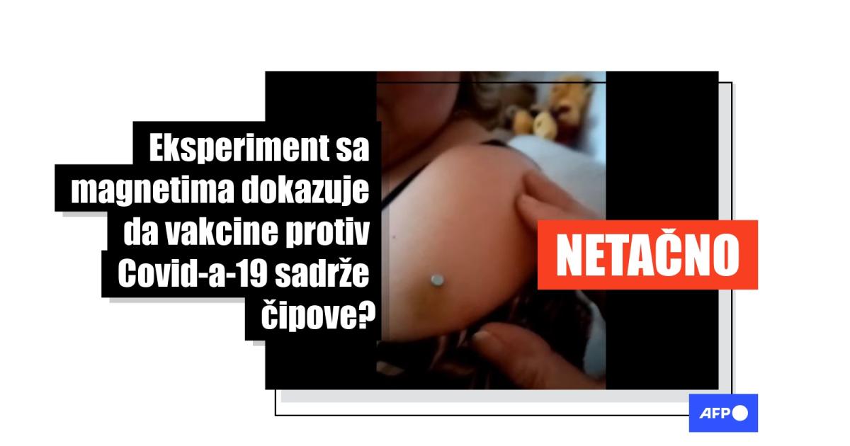 “Nakon cijepljenja sa Fajzerom magnet čvrsto stoji gospođi na mjesto cijepljenja,” piše u opisu videa postavljenog na Fejsbuku 8. maja i podeljenog više od 1.200 puta za manje od dve nedelje. Snimak prikazuje muškarca kako gura nešto što liči na mali magnet na ruci jedne žene dok se ne zalepi. “Evo, ovdje, kako čvrsto magnet stoji… Očito da nešto ima,” komentariše.