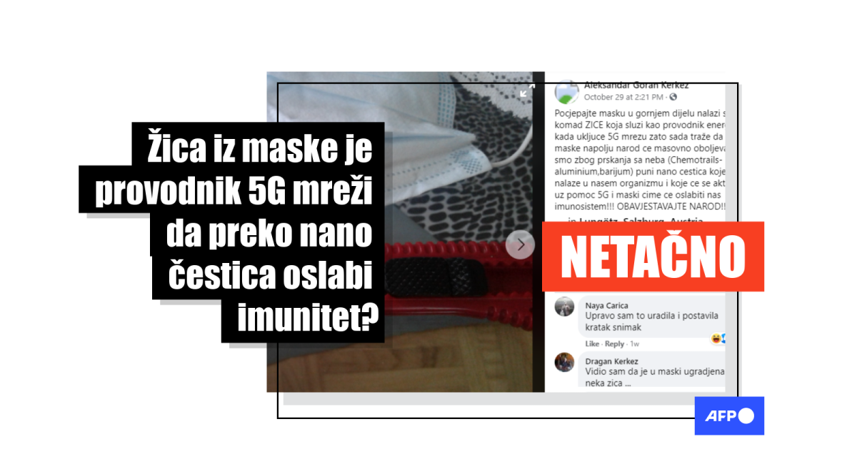 “Pocjepajte masku u gornjem dijelu nalazi se komad ZICE koja sluzi kao provodnik energije kada ukljuce 5G mrezu zato sada traze da nosite maske napolju narod ce masovno oboljevati jer smo zbog prskanja sa neba (Chemtrails-aluminium, barijum) puni nano cestica koje se nalaze u nasem organizmu i koje ce se aktivirati uz pomoc 5G i maski cime ce oslabiti nas imunosistem!!! OBAVJESTAVAJTE NAROD!!!,” navodi se u jednoj Fejsbuk objavi koja je, zajedno sa drugim, podeljena više od 5.300 puta i pregledana 427.000 puta od 29. oktobra.